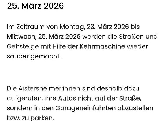 ACHTUNG: vom 23. bis 25. März ist bei uns die Straßenkehrmaschine unterwegs. Bitte in diesem Zeitraum keine Autos an der Straße abstellen, Danke…