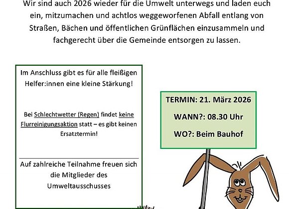 Mit der "hui statt pfui" Flurreinigungsaktion machen wir gemeinsam unsere Wege und Grünflächen wieder sauber. Wir laden alle sehr herzlich ein,…
